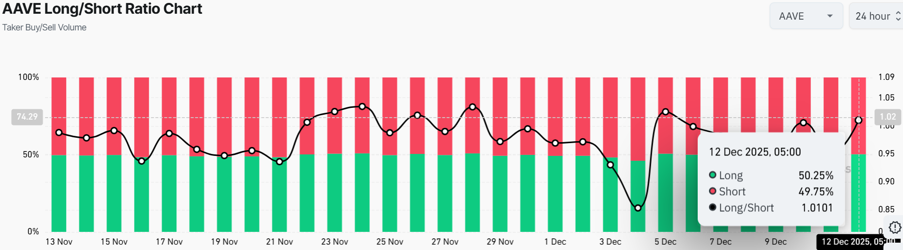 The data on the funding rate provided by Aave on the derivatives side also indicates the presence of a rally. CoinGlass data on OI-Weighted Funding rate indicates that the volume of people who are betting on the price of Aave further falling is smaller than those who are betting that it will rise.