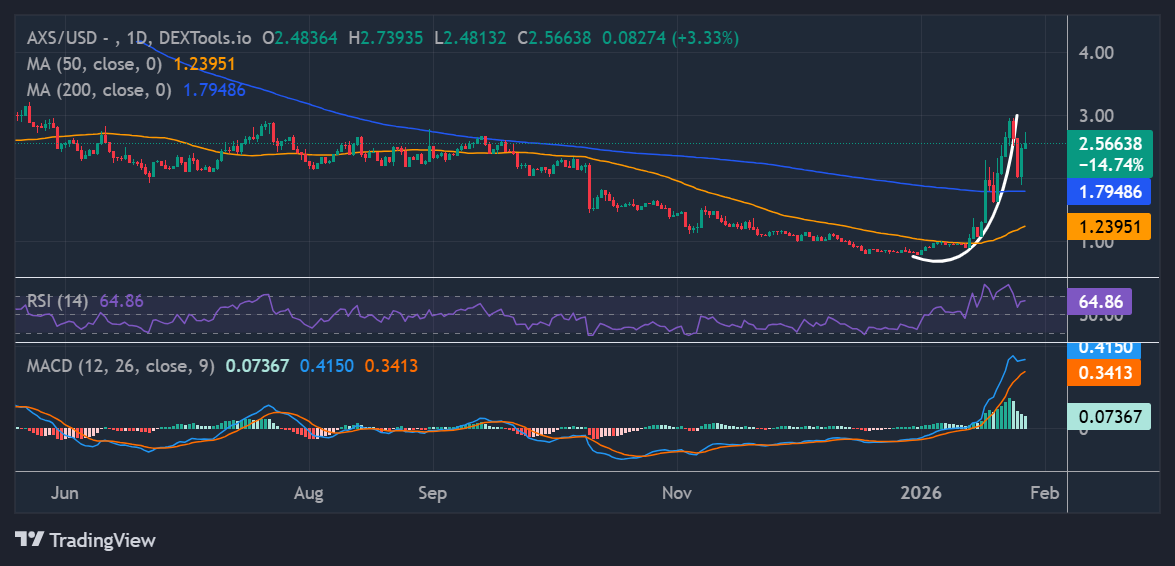 The Axie Infinity price has surged 6% in the last 24 hours to trade around $2.56. Technical indicators suggest that AXS may be building momentum for a stronger upside move, supported by improving market sentiment and growing institutional interest.