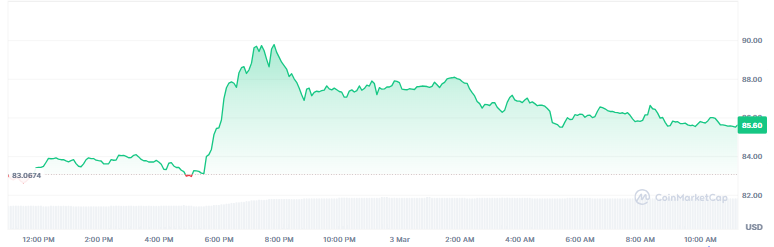 Solana has been performing well recently with a surge of more than 10% on the monthly chart. Currently, the price is up by 1.70%, trading at around $85. Moreover, its market capitalization and trading volume have surged to $48 billion and $5.30 billion, respectively.