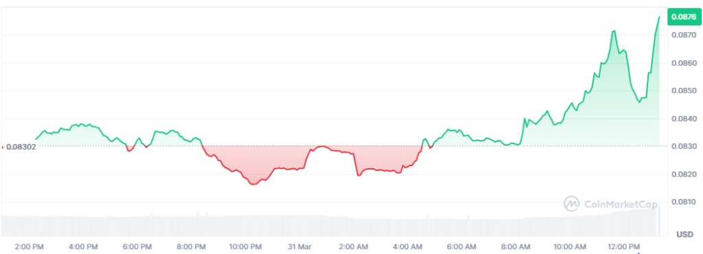 Algorand has defied the broader weakness in the market today by recording a surge of more than 5% in the last 24 hours. The price has been steadily rising, reaching highs of $0.08706. Moreover, its trading volume has exploded by 60% to $35 million.