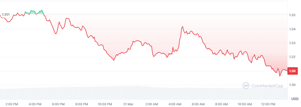 XRP has continued its downtrend since the price faced a stiff rejection at the $1.60 mark. The price is hovering around $1.30, down by 2.60% on the daily chart. Its market capitalization has declined to $80 despite the trading volume surging by more than 12% to $1.85 billion.