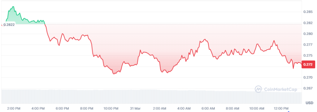 Worldcoin has declined by over 4% over the last 24 hours following the broad market downturn. This latest decline has pushed the weekly and monthly declines to 14% and 30%, respectively. As of this writing, the price is hovering around $0.272, with a market capitalization of $890 million.