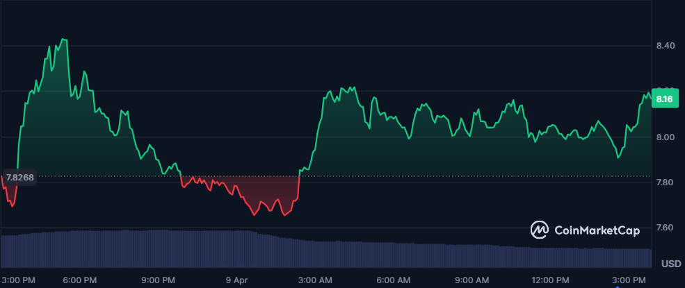 If that ceiling holds, analysts expect the price to revisit the $7.740 to $7.549 demand zone. A sharper rejection could then expose the $7.300 liquidity area, while current volume signals a decisive move may be close. For now, the chart remains range-bound, but failed pushes into resistance keep downside risk in focus on the lower timeframe.