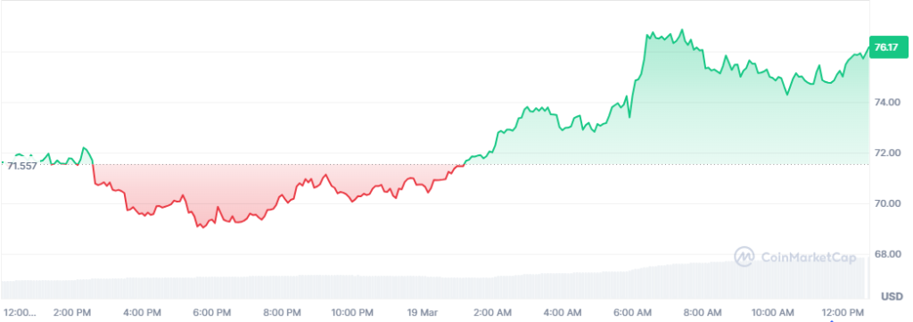 Quant is up by more than 6% on the daily chart amid the broad market downturn. As of this writing, the price is resting around $76, pushing the weekly gains to 20%. In addition, its trading volume has exploded by 120% to $27 million.