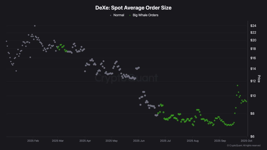Whales have shown an uptick in activity around DeXe recently, according to CryptoQuant data. Large wallet orders surged, which points to increased investor demand. This is often an indication of tightening supply against rising interest.