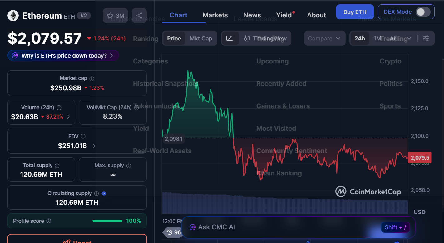 ETH is trading at $2,079, representing a 1.24% decrease over the past 24 hours. The market cap stands at $250.98 billion, while the trading volume has decreased by 37.21% to $20.63 billion.