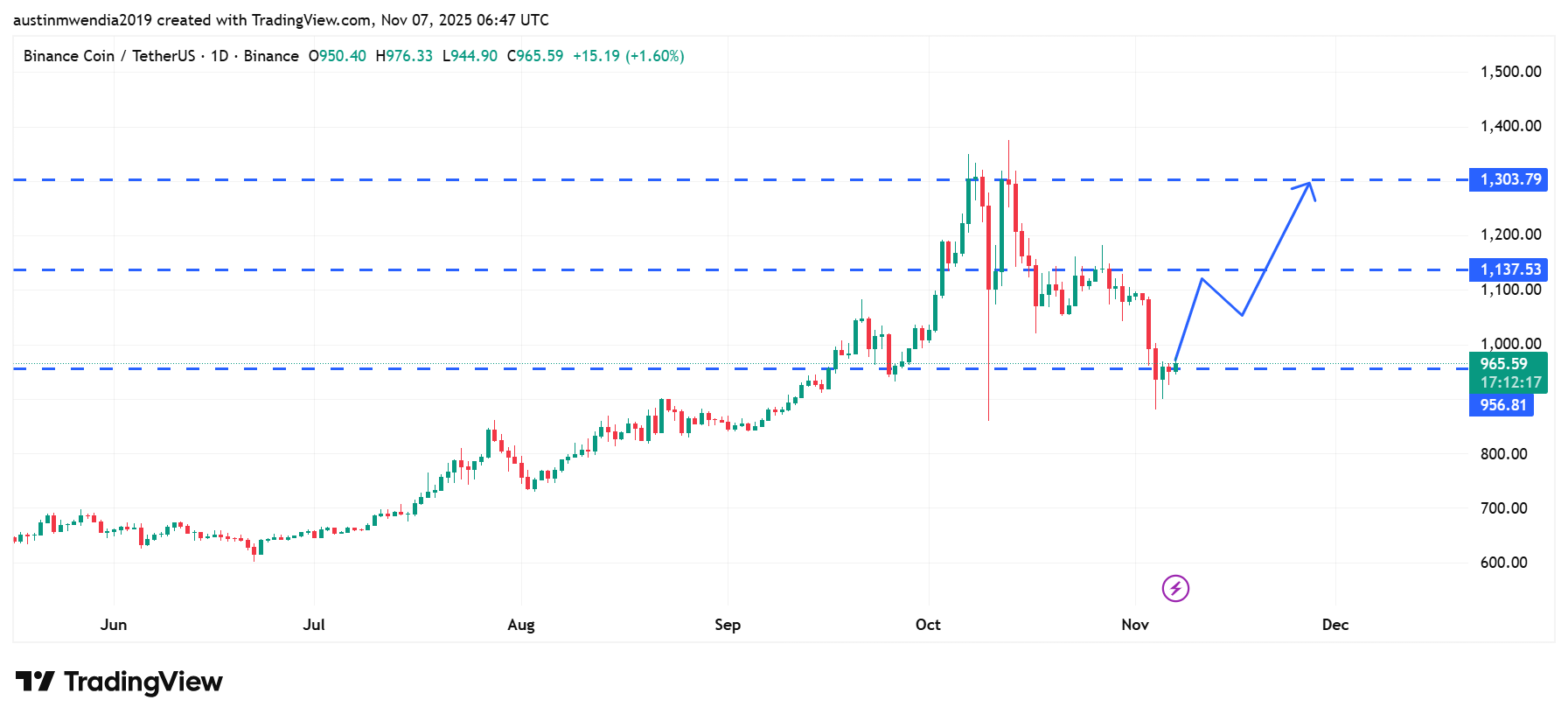 - BNB is holding strong above key support at $956, with bulls eyeing a breakout above $1,137.