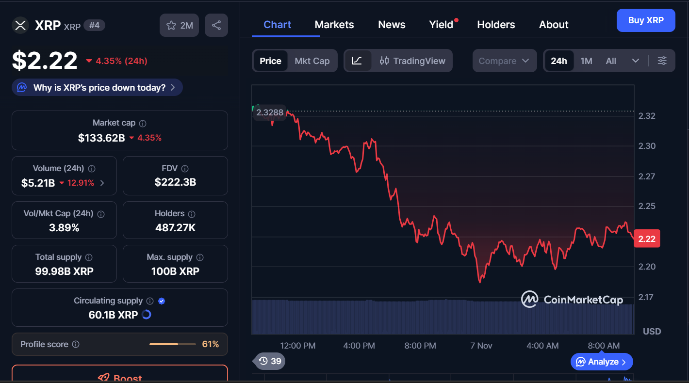 XRP is trading at $2.22 after a sharp downward movement from the $2.32 mark, losing 4.35% in the past day. The market cap of the coin stands at $133.62 billion, while the trading volume is down 12.91% to $5.21 billion.