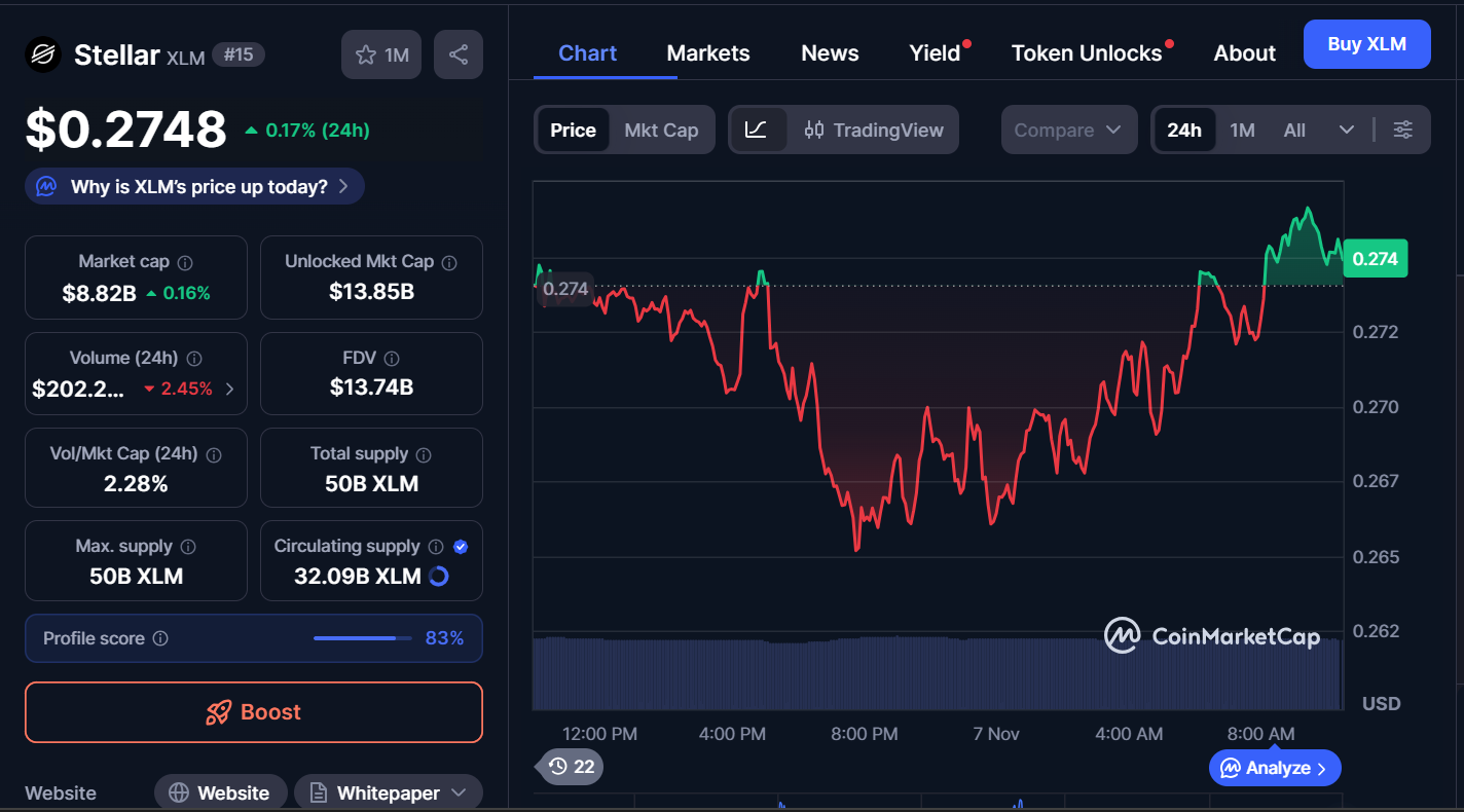 XLM is currently trading at around $0.2748, with a 0.17% increase in the past day. Its trading volume is down by 2.45% to $202.2 million, while the market cap stands at $8.82 billion.