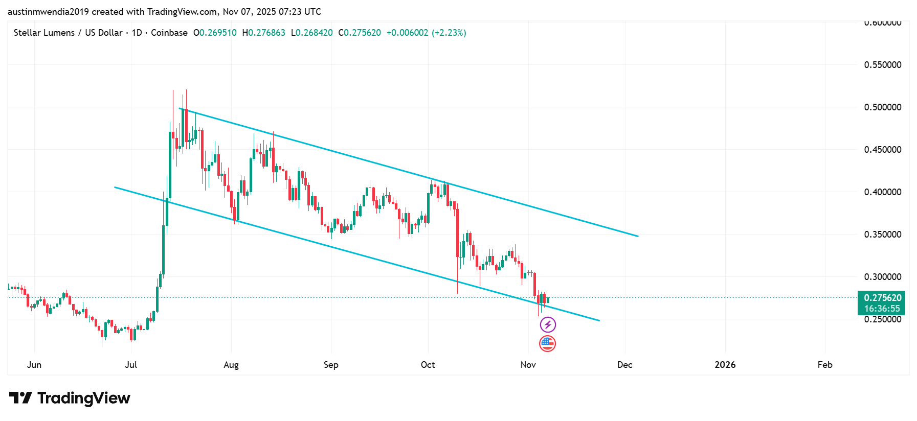 - Stellar is trading in a descending channel with buyers defending the $0.26 price level.