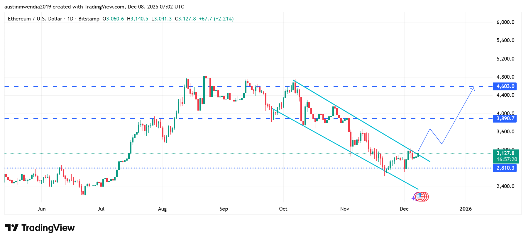 A clean push above this level could open the path toward $4,603. This area acted as a major ceiling in past rallies and now serves as the main upside target. Ethereum must hold above the breakout zone to sustain its recovery. The continued strength could drive a steady climb into early 2026.