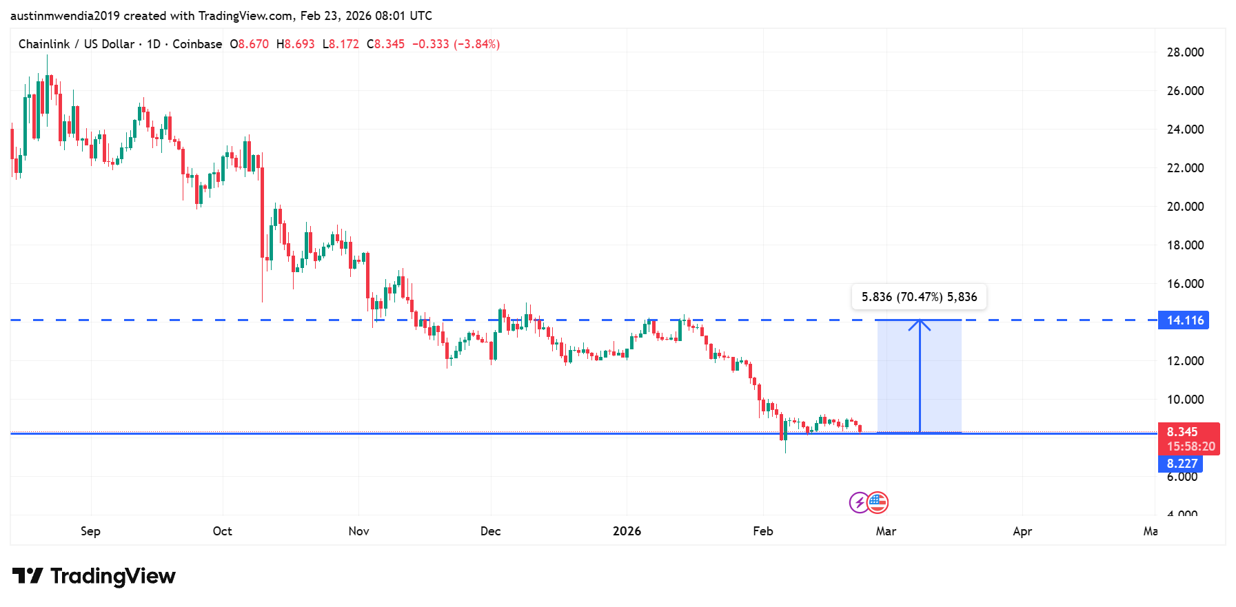 - Chainlink is trading near $8.30 as sellers stay active, and a drop below $8.20 could send the price toward $7.