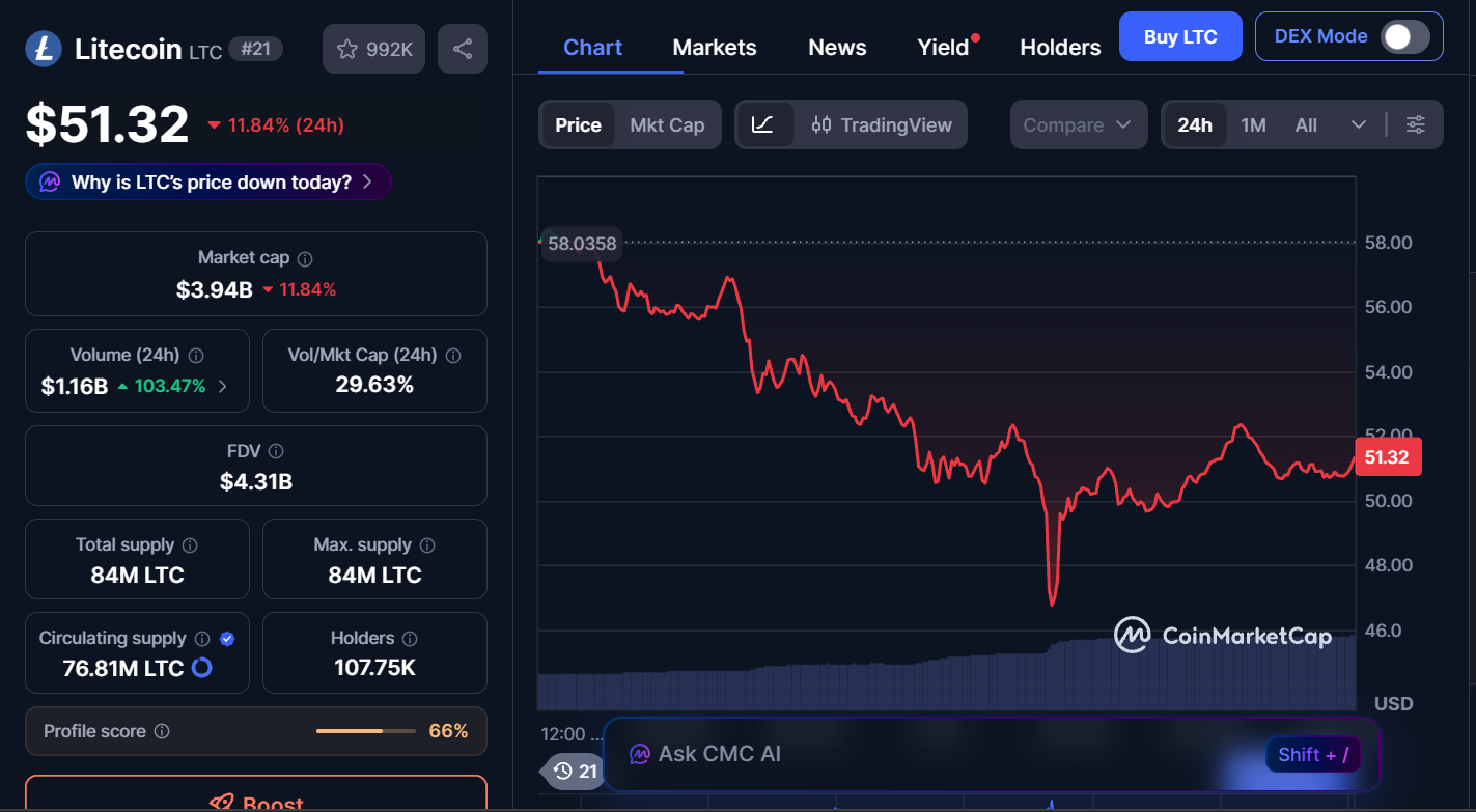 LTC is trading at $51.32, an 11.84% decrease in the past day. The trading volume has increased by 103.47% to $1.16 billion, while the market cap stands at $3.94 billion. Meanwhile, the coin has lost 38.02% on the monthly chart.