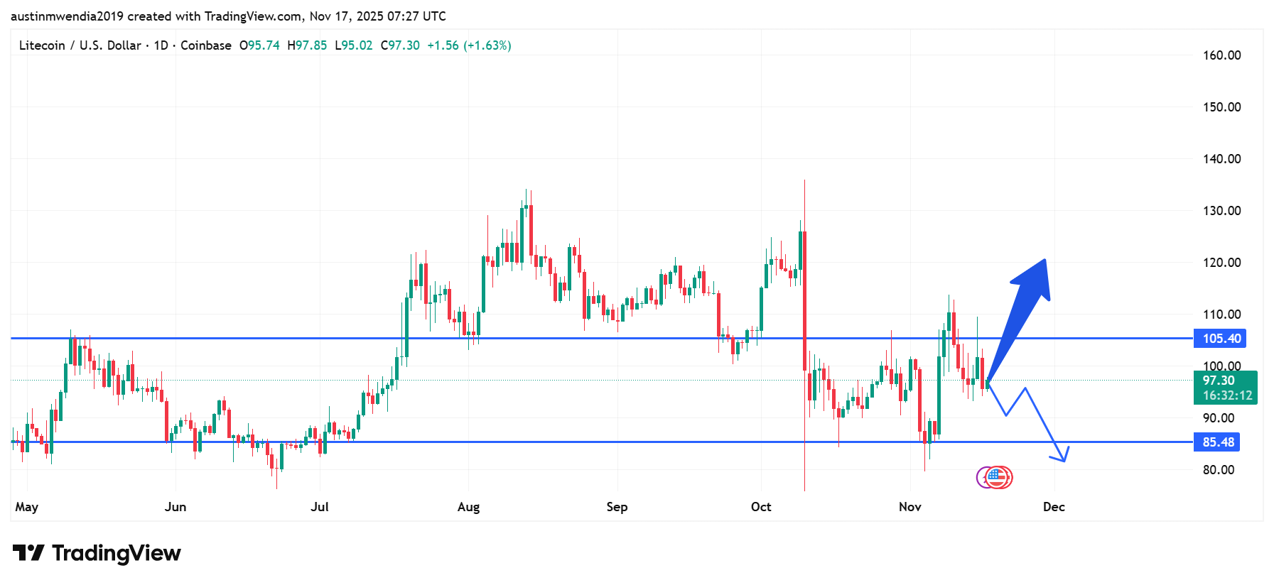 • Litecoin is testing strong support at $85.48, while a breakout above $105.40 could trigger a rally toward $120.