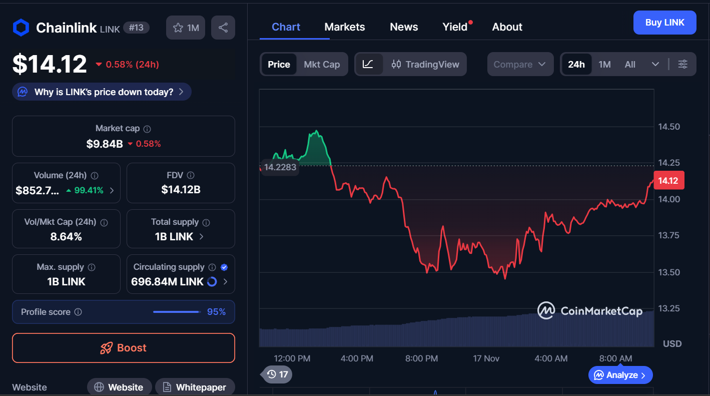 LINK is currently trading at $14.12, with a 0.58% decrease in the last 24 hours. The trading volume of the coin is up by 99.41% to $852.7 million, while the market cap stands at $9.84 billion.