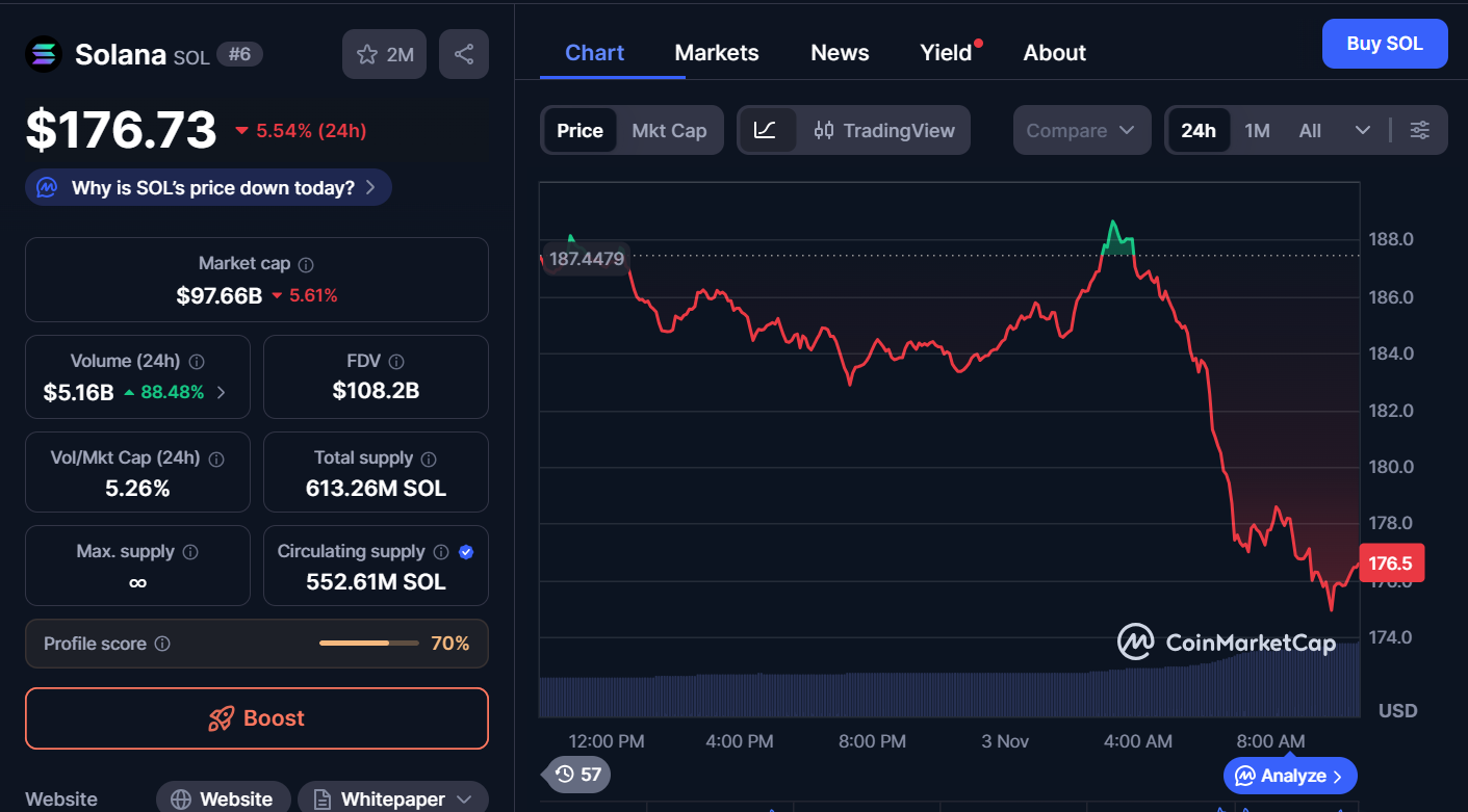 SOL is currently trading at around $176.73, with a 5.54% decrease in the past day. The trading volume of SOL has increased by 88.48% to $5.16 billion, while the market cap stands at $97.66 billion.