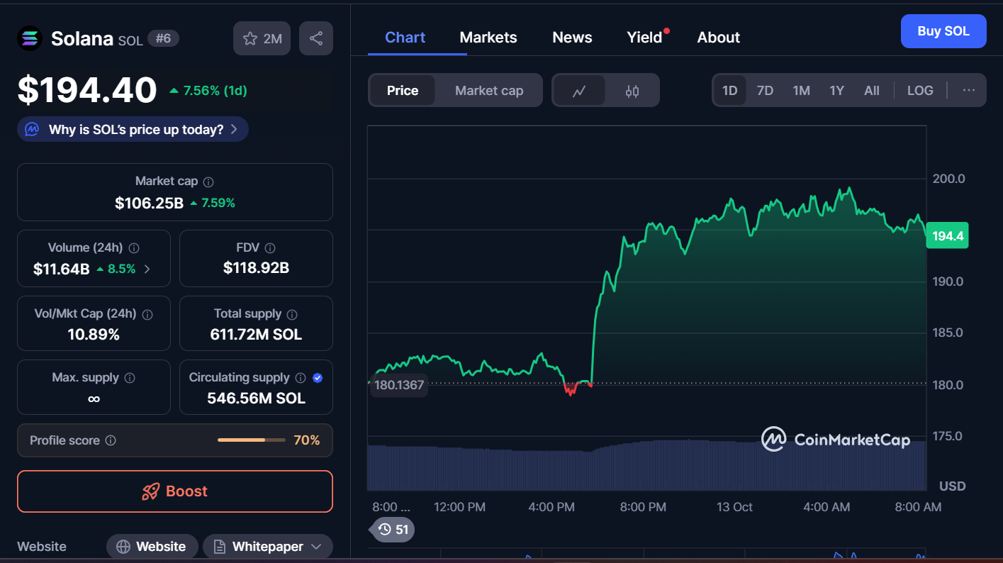 SOL is currently trading at around $194.39, with a 7.56% increase in the past day. In addition, its trading volume is up 8.5% to $11.64 billion, while the market cap stands at $106.25 billion.