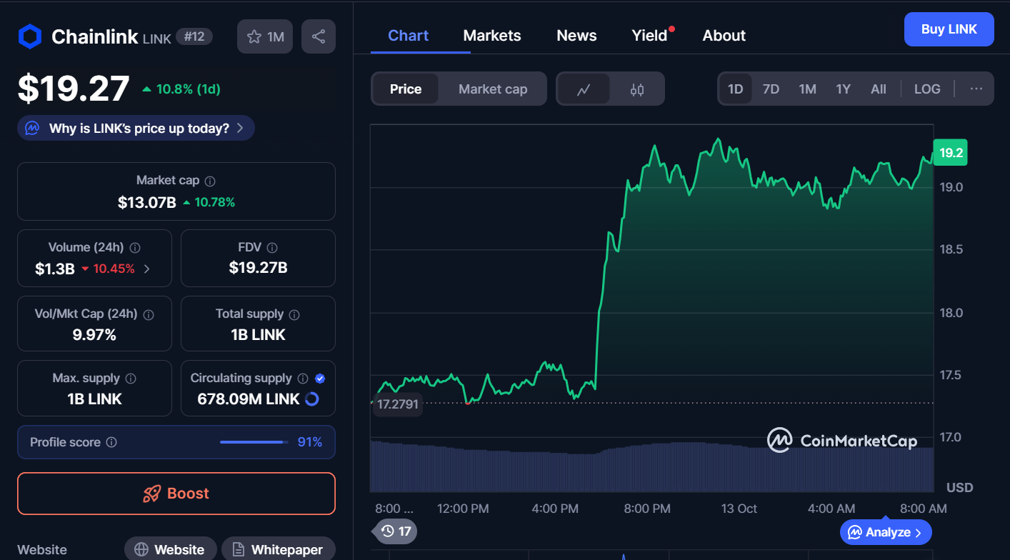 LINK is currently trading at $19.27, with a 10.8% increase in the last 24 hours. The trading volume of the coin has decreased by 10.45% to $1.3 billion, while the market cap stands at $13.07 billion.
