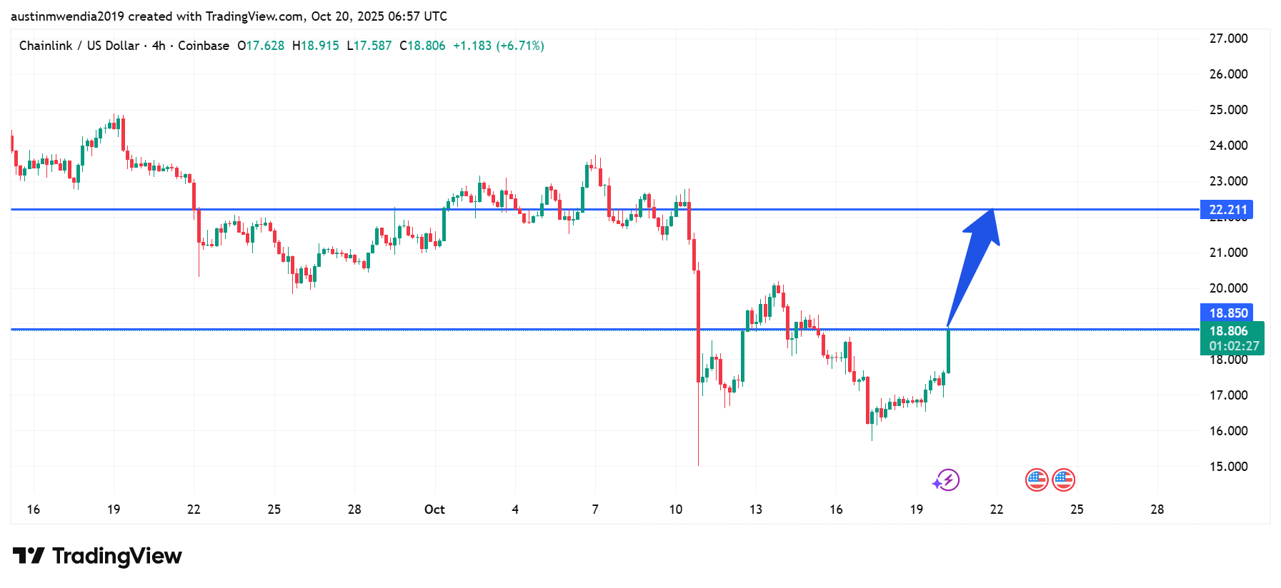 - Chainlink has broken above the $18.50 resistance with rising volume and may target the next level near $22.20 soon.