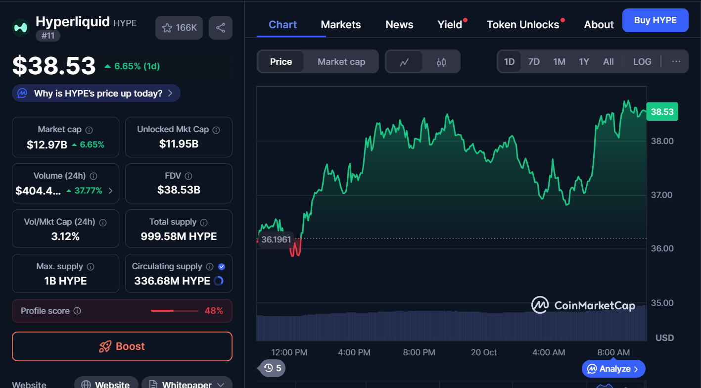 HYPE is currently trading at around $38.53, with a 6.65% increase in the past day. Its trading volume has increased by 37.77% to $404.4 million, while the market cap stands at $12.97 billion.