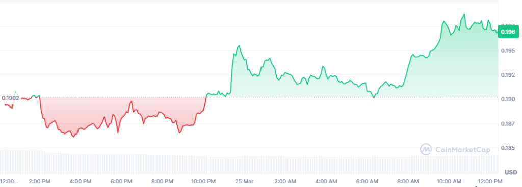 The Solana-based memecoin, Dogwifhat, has displayed strong momentum following the market rebound. As of this writing, the memecoin is exchanging hands at around $0.196, up by 4% on the daily chart. Its market capitalization stands at $197 million.