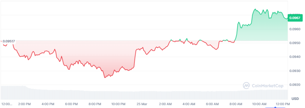 The largest memecoin, Dogecoin, is up by more than 2% over the last 24 hours. This latest rally comes amidst the recent setback, which saw the price drop below the $0.1000 key level. Currently, the price is trading around $0.0967, with a market capitalization of $14 billion.