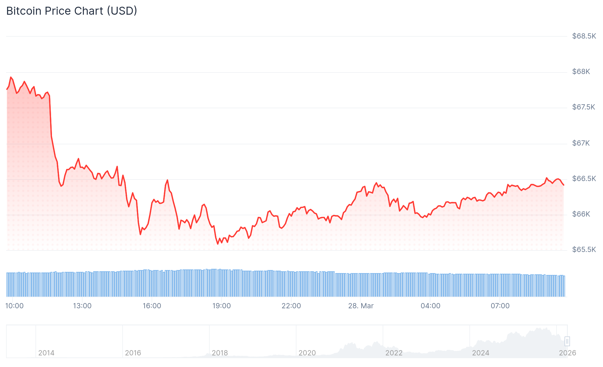 At the time of press, the crypto market is down 1.9% in the past 24 hours. Its market capitalization is $2 376 trillion, with a trading volume of approximately $99.793 billion. Bitcoin’s dominance has dropped slightly to 56%, while ETH’s continues to sit at 10.2%. Bitcoin’s price is down 2% in the past 24 hours. It is trading at roughly $66,416, with a market cap of $1.3 trillion and a trading volume of $44.3 billion. Over the past week, month, and year, BTC has dropped by 6.1%, 2.1%, and 22.5%, respectively. The asset is also 47.3% below its all-time high price of $126,080.