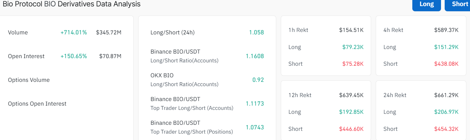 The derivatives data on BIO show great statistics that increase the popularity of the asset. The BIO derivatives trades have grown by 714.01% to $345.72 million. On the same note, the open interest in BIO contracts has increased by 150.65% to reach an interest of $70.87 million. This is an indication that there is an interest in the asset, and traders are jumping into positions in different exchanges.