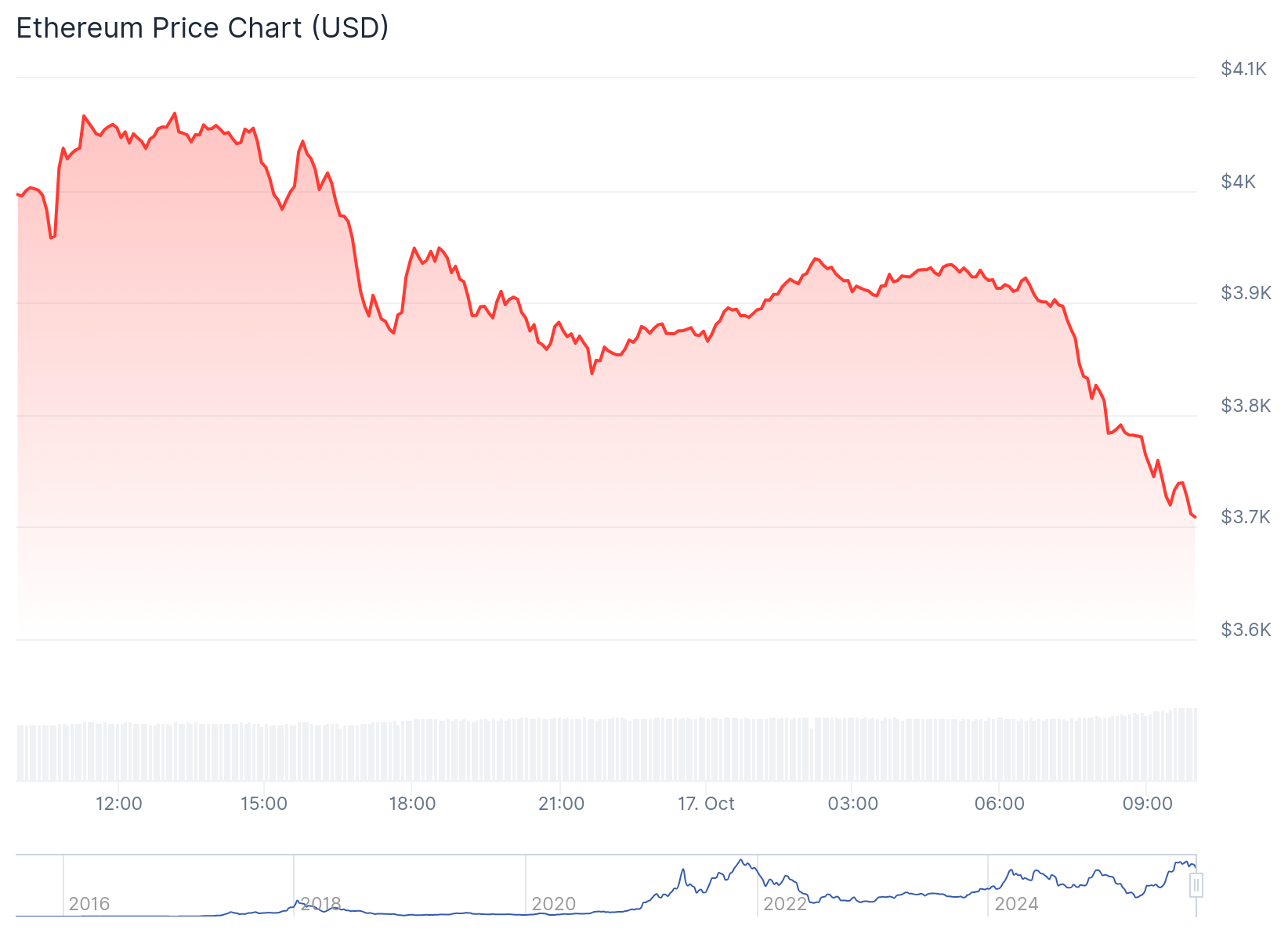 On its part, Ethereum is down 7.2% in the past 24 hours, trading around $3,700. ETH’s 7-day-to-date, 14-day-to-date, and month-to-date variables also reflected declines of 14.3%, 16.8%, and 18.4%, respectively. Ethereum’s market cap dropped to $447.67 billion, while its trading volume appreciated 32.49% to reach $58.54 billion.