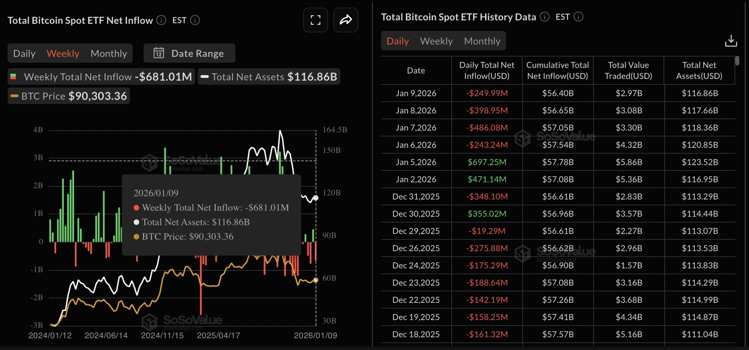 The flow of BTC ETFs is a sign of the weakened institutional support. According to Sosovalue, Bitcoin spot ETFs recorded an outflow of $681.01 million over the past week, with four consecutive days of outflows.