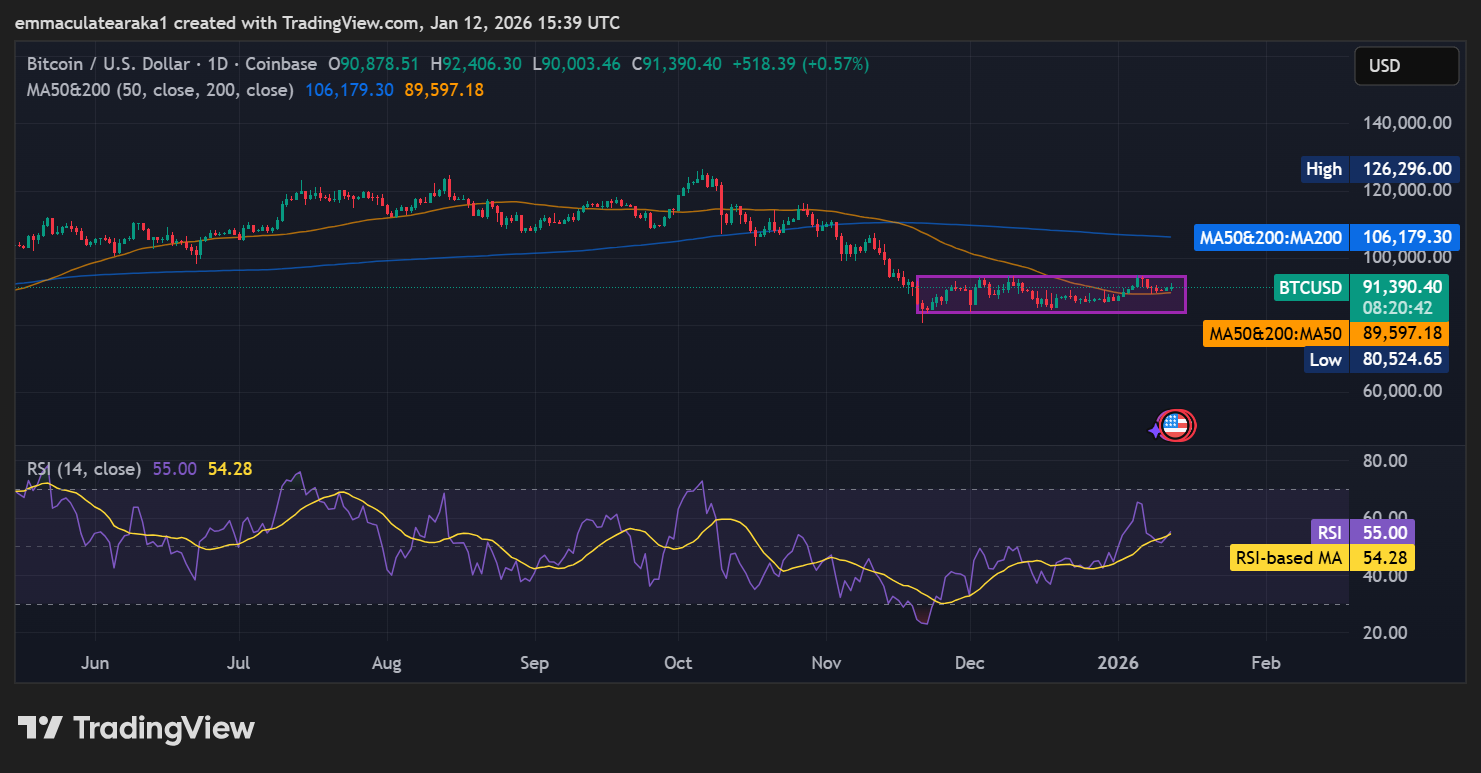 Technical indicators indicate that Bitcoin is cooling off after the recent surge that saw it reach $94,200 on January 5. The Relative Strength Index (RSI) is at 55.00, meaning the coin is neither overbought nor oversold, which could signal room for more consolidation before the next large move. The MACD indicator has, however, flipped positive, indicating rising momentum and a possible risk of further upside.