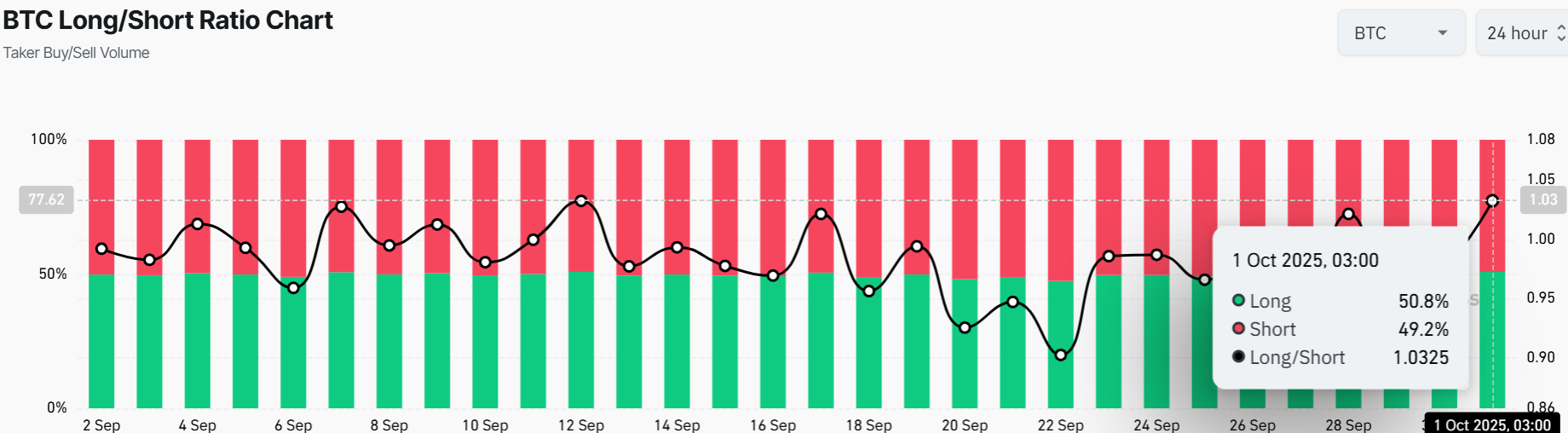 The Bitcoin long-short ratio chart, updated as of October 1, 2025, reflects that the ratio is almost even, at 51.26% long versus 48.74% short. This indicates very slow improvement, but with the long-to-short ratio standing at 1.0517, it indicates that the bulls are having the upper hand.