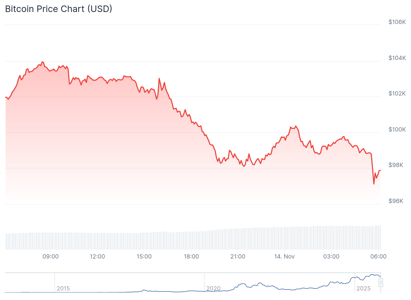 The company reported that it earned 520 BTC, worth an average of $48,200 per BTC. Currently, Bitfarms holds 1,827 BTC. Meanwhile, Google Finance data showed that the company’s shares took a 17.98% hit today, closing the trading day at $2.60. Similarly, Bitcoin dropped 3.2% in the past 24 hours, trading at $97,839, with a trading volume of $103.47 billion and a market cap of $1.97 trillion. BTC’s 7-day-to-date price change variable reflected a 2.8% decline, with price extremes fluctuating between $98,191.19 and $106,562.