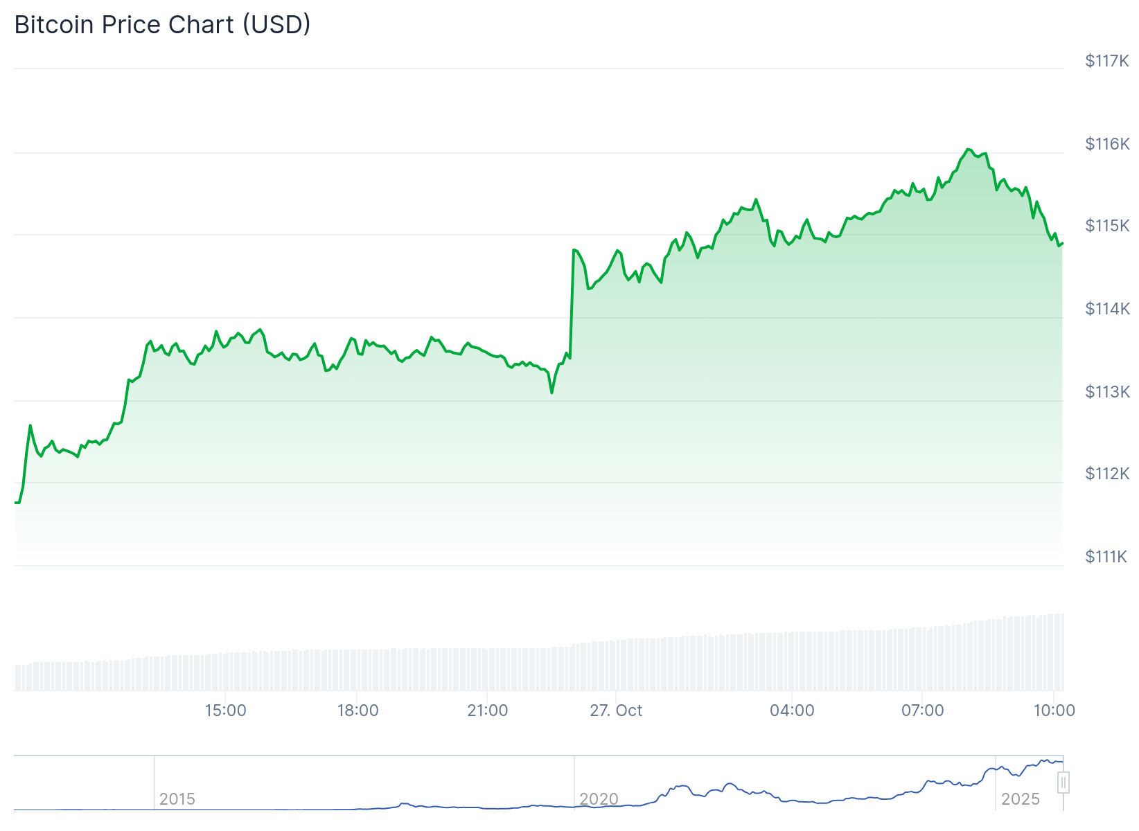 BTC is trading at $114,920 following a 2.8% upswing in the past 24 hours. Within the same timeframe, BTC fluctuated between $111,755 and $116,032 with a trading volume of $62.8 billion. Other extended-period price change variables, including BTC’s 7-day-to-date and month-to-date, reflected increments of about 3.4% and 5%, respectively.