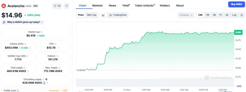 Following the Avalanche ETF filing update, AVAX experienced a price increase of more than 7% to $14.96. The volume of trading also experienced a surge of 11%, which is a good indicator of the market’s strong interest.