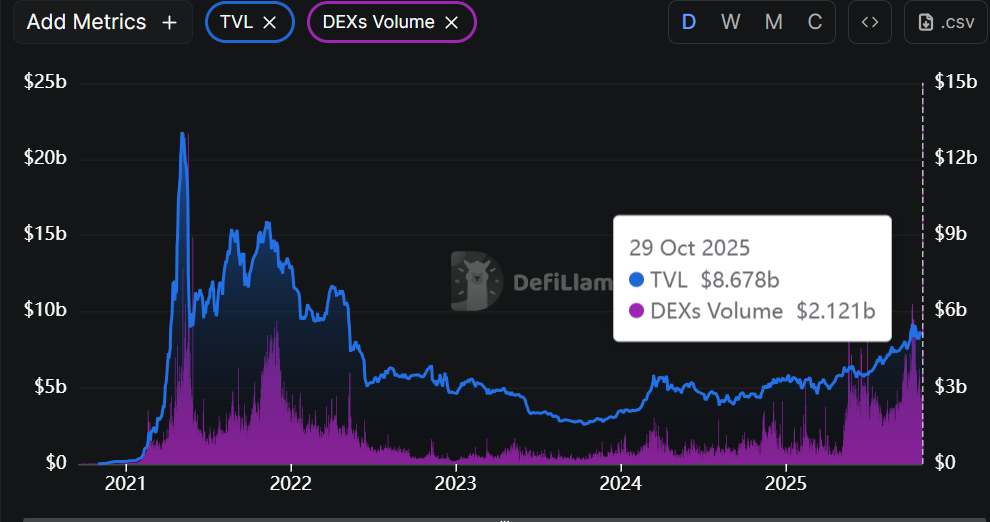 According to DeFiLlama data, the volume of the Decentralized Exchanges (DEXs) is down to at least $2.12 billion in comparison to the high of $6.313 billion on October 8, which also means low on-chain liquidity.