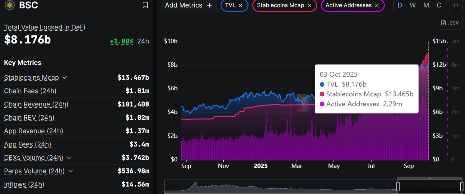 Meanwhile, data shows Binance Smart Chain’s (BSC) DeFi ecosystem is experiencing a strong growth comeback after the previous slump. BSC’s Total Value Locked (TVL) reached $8.176 billion by October 3, 2025, indicating a solid growth rate of 1.80% over the last 24 hours. The rise in liquidity demonstrates the BSC ecosystem’s growing power, as well as its ability to maintain substantial liquidity despite market volatility.