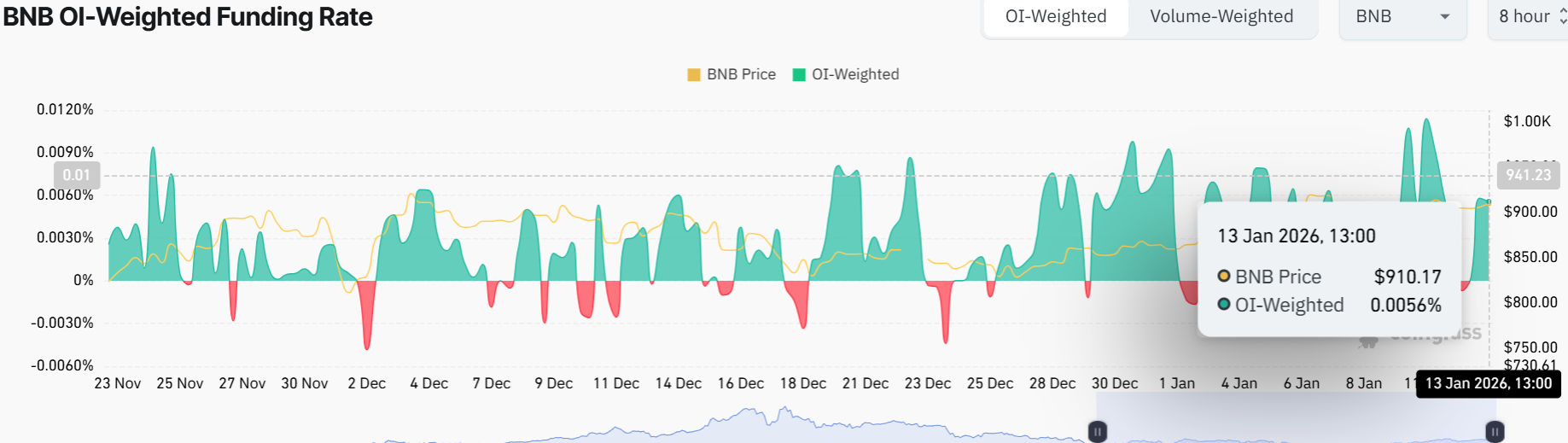 Additionally, the bullish bias is evident in BNB, as its funding-rate data have turned positive. According to CoinGlass data, the OI-Weighted Funding rate indicates that the trading community is betting on an increase in the BNB price.