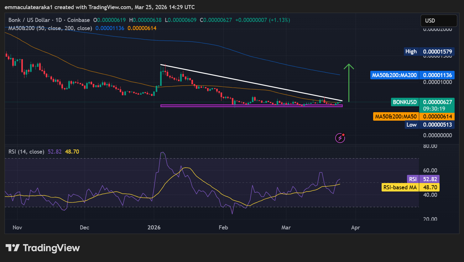 BONK’s daily chart price action has caught the investors’ attention with strong support and resistance shown at key moving averages. The meme coin is now trading at $0.0000062, just above the 50-day Simple Moving Average (SMA) at $0.0000061. However, the immediate resistance zone around $0.000011, aligning with the 200-day SMA, is cushioning the bulls against any upside.
