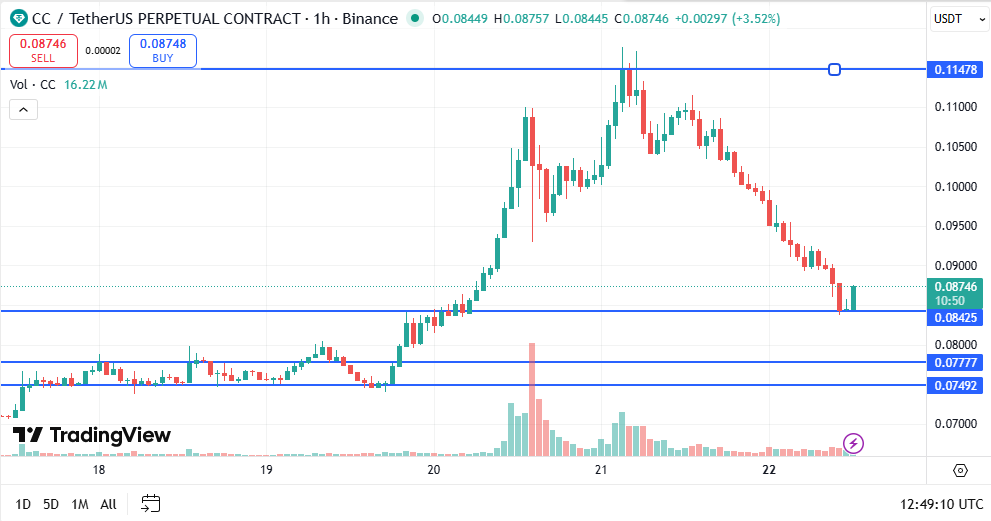 Canton (CC) has experienced a sharp correction in the last 24 hours. In this period, Canton has dropped by 22% to trade at $0.088. Interestingly, the sharp correction has also been followed by a significant drop in trading volumes.