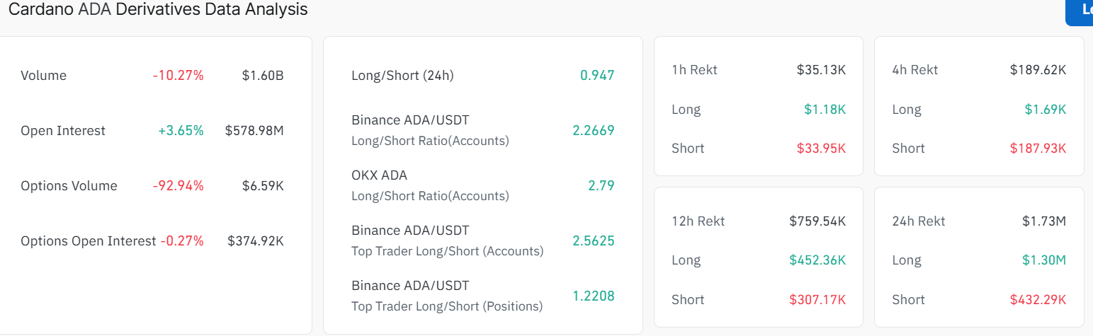 On the other hand, the derivatives market is showing mixed signals. According to Coinglass data, the ADA open interest has soared 3.65% to $578 million, indicating renewed confidence, as new money is flowing into the ADA market. This recent surge in OI may cause ADA bull’s eye a rebound to $0.36 in Cardano price if they show momentum.