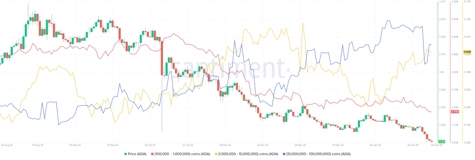 The data of Supply Distribution provided by Santiment suggests a bearish outlook of a more significant decrease in the number of large-wallet holders (whales) exposed to Cardano. The measure shows that whales that are 100,000 to 1 million (red line), 1 million and 10 million (yellow line), and 10 million and 100 million ADA tokens have lost 160 million tokens since Thursday.
