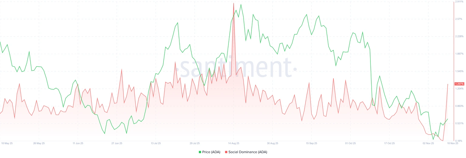 The Social Dominance metric of Santiment on Cardano also indicates a buyer-friendly future. The index is a percentage of ADA-related discourse in the cryptocurrency realm. On Monday, it increased to 1.29% up from 0.18% on Saturday, the highest level since the end of September. This increase reflects the interest of a larger number of investors and greater attention to Cardano.