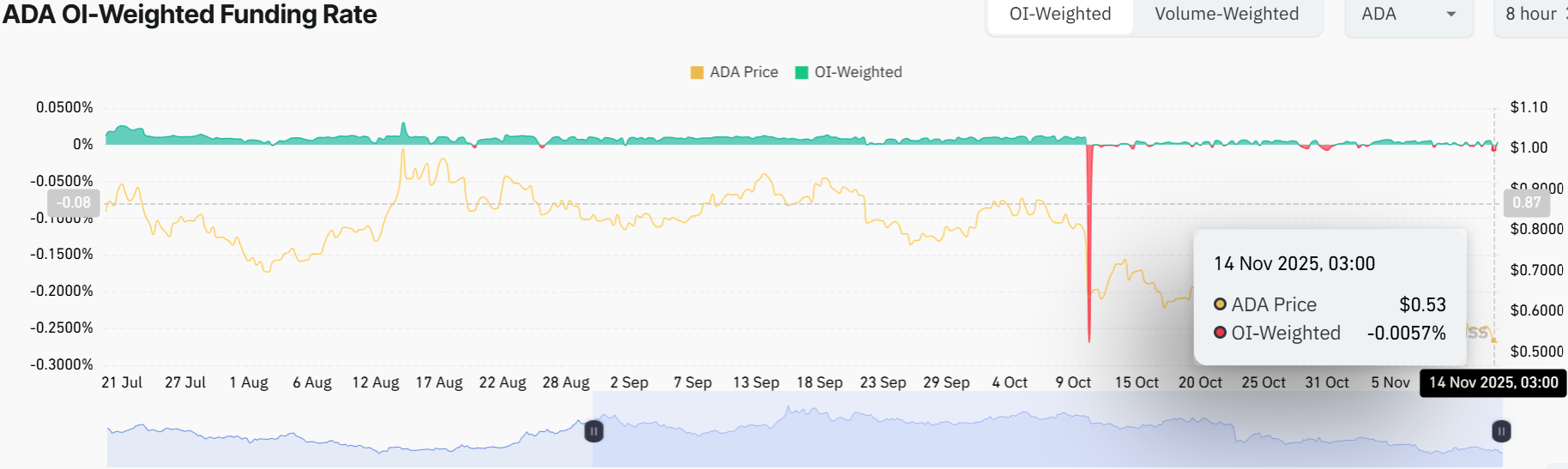 According to the OI-Weighted Funding Rate provided by Coinglass, the percentage of traders who expect the price of ADA to fall further is much higher than those who expect a rise. The indicator has reversed to a negative value and currently stands at -0.0057%. This is almost the same as the price drops at the end of October. The unfavourable ratio indicates that shorts are paying longs, implying that there is a bearish mood towards ADA.