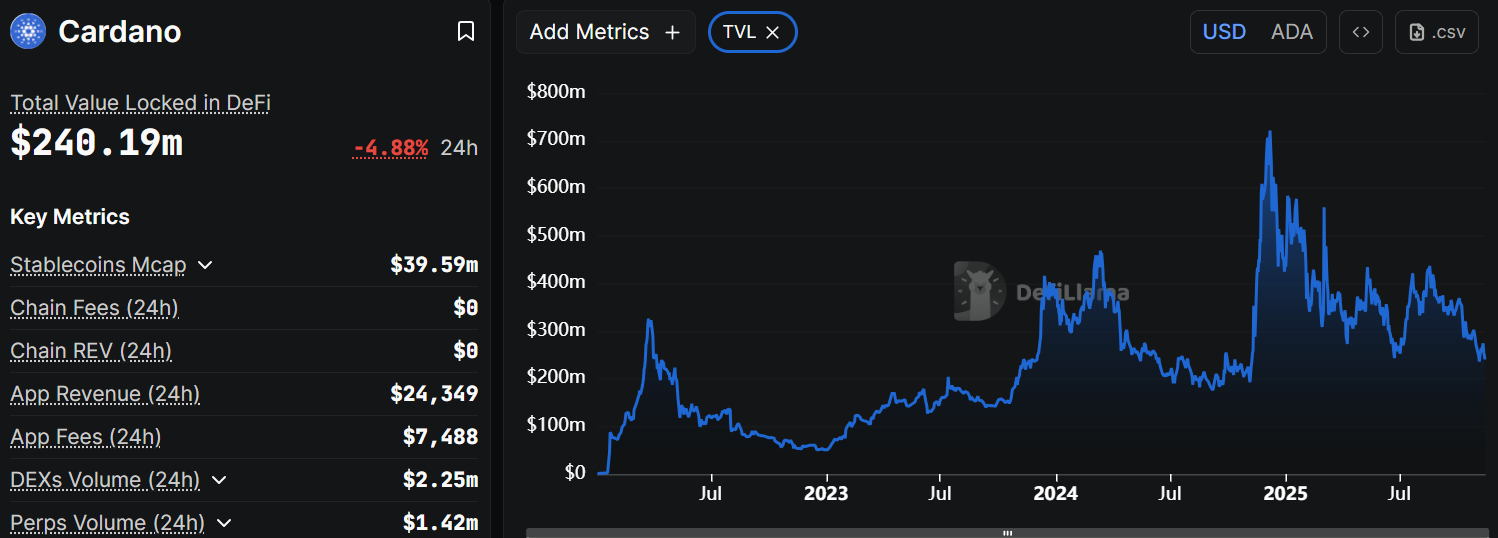 According to DefiLlama, Cardano DeFi TVL has gone down to $240.19 million on Friday and has been in a downward trend since mid-August. The declining TVL indicates unhealthy activity and declining user interest in the Cardano ecosystem. This means that fewer users are depositing with ADA-based protocols, which is not a promising sign for its price.