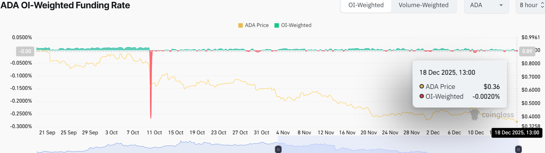 The measure has flipped negative on Thursday to -0.0020%, implying that shorts are paying longs. Traditionally, the ADA prices dropped drastically when the funding rates flipped to the negative.