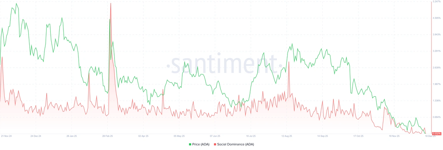 - ADA on-chain activity shows a drop in social dominance, suggesting a bearish grip.