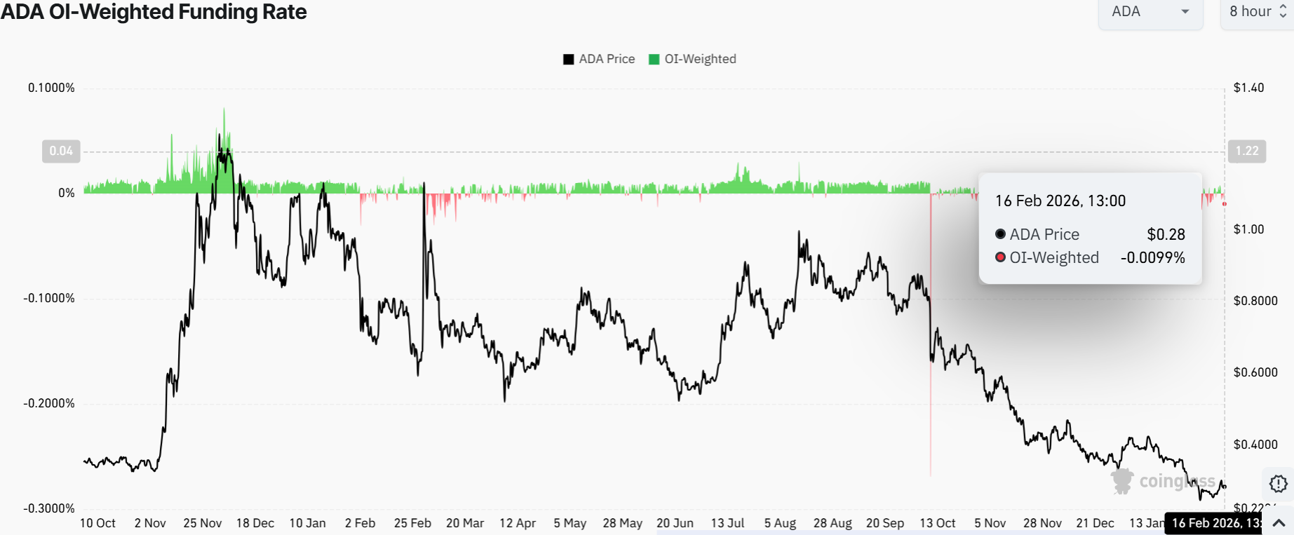 According to the CoinGlass data, the ADA futures Open Interest (OI) has decreased to $437.01 million. This marks an 8.92% slip during the last 24 hours, and this represents a significant outflow of ADA derivatives, most likely caused by the liquidation waves.