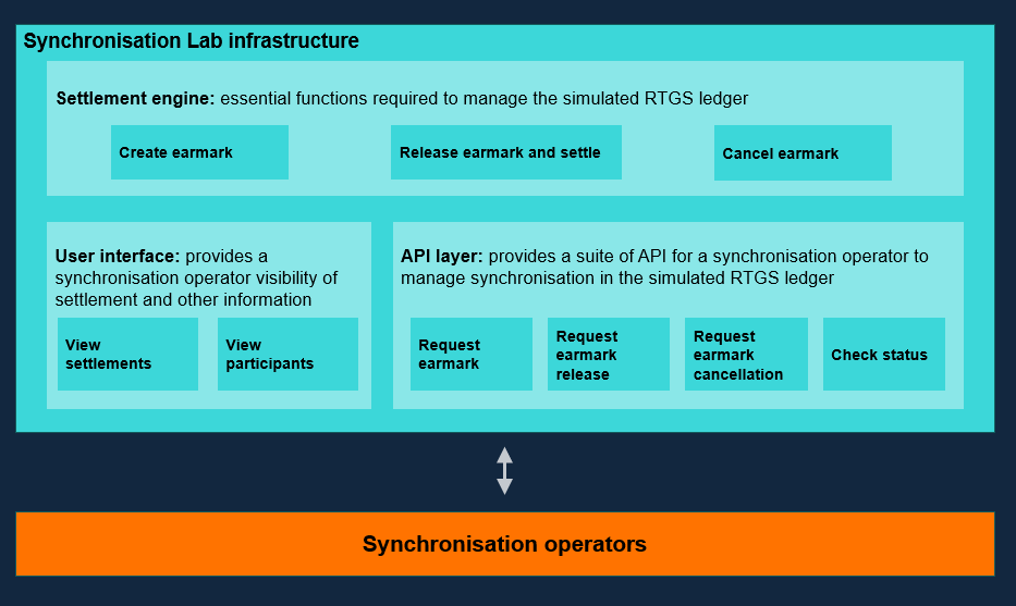 The Lab infrastructure consists of a simulated settlement engine, API suite, and dashboard for operators. Chainlink and other participants will use integrations on top of this platform to demonstrate the interaction of their systems with RT2 users. The Bank of England will experiment with two synchronization flow models.