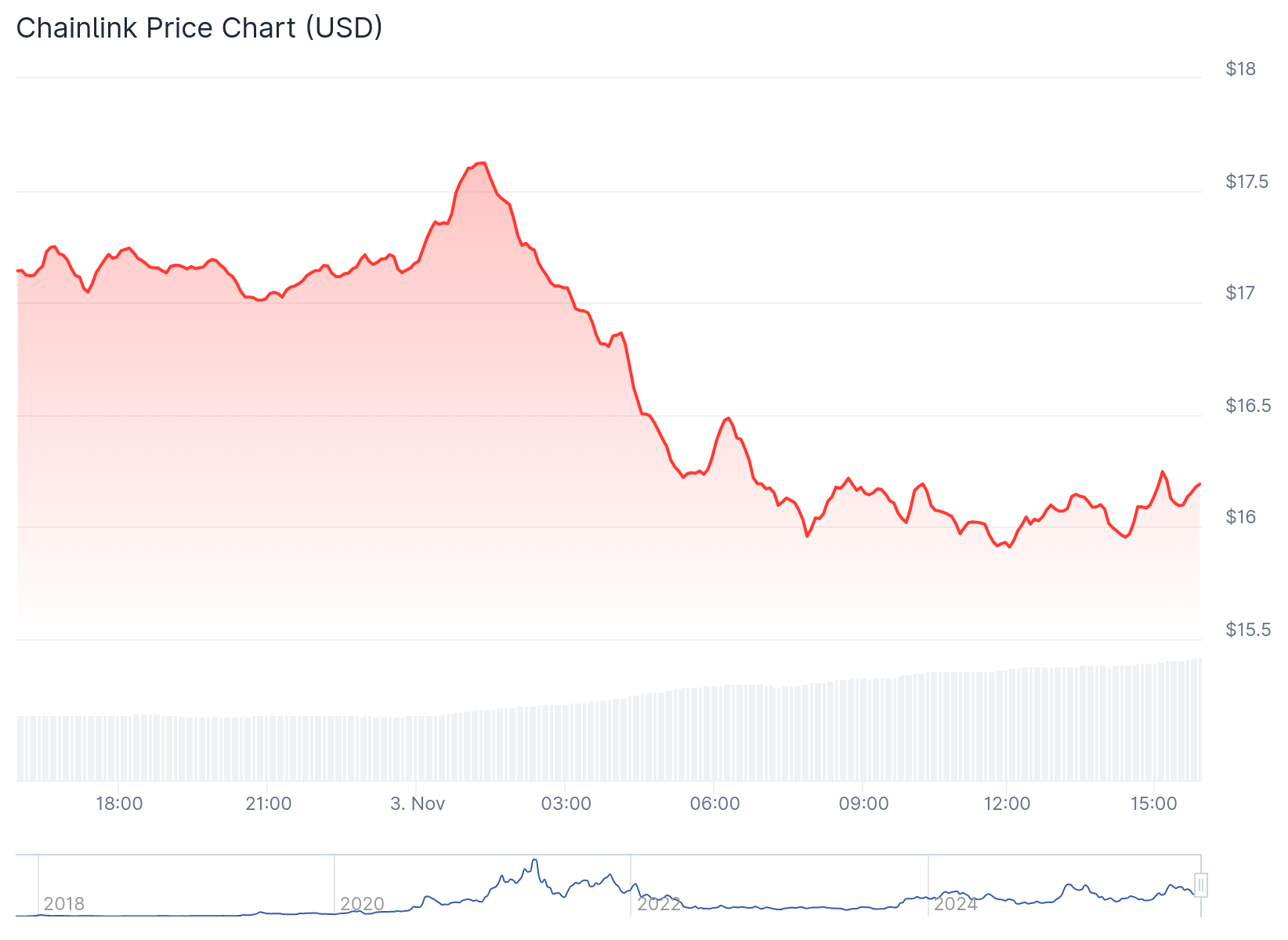 At the time of writing, LINK’s price is 5.6% down in the past 24 hours, trading at $16.22. In the past week and month, LINK dropped 11.8% and 26.1%, respectively, underscoring its current struggle. Meanwhile, on CoinGecko, it ranks as the sixteenth most valuable cryptocurrency with a market cap of $11.29 billion.